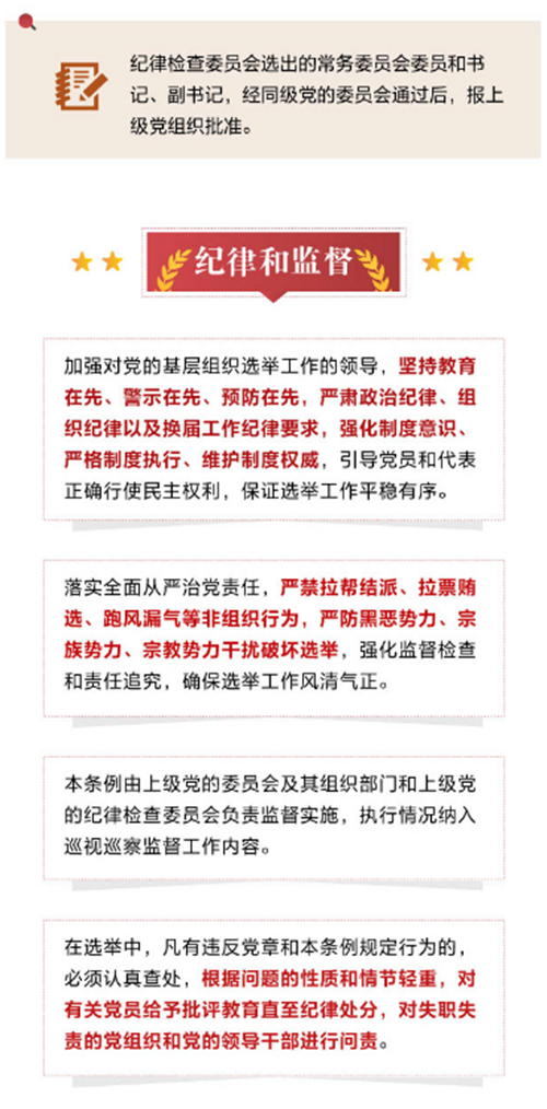 第六章 纪律和监督第三十五条 加强对党的基层组织选举工作的领导,坚持教育在先、警示在先、预防在先,严肃政治纪律、组织纪律以及换届工作纪律要求,强化制度意识、严格制度执行、维护制度权威,引导党员和代表正确行使民主权利,保证选举工作平稳有序。落实全面从严治党责任,严禁拉帮结派、拉票贿选、跑风漏气等非组织行为,严防黑恶势力、宗族势力、宗教势力干扰破坏选举,强化监督检查和责任追究,确保选举工作风清气正。第三十六条 本条例由上级党的委员会及其组织部门和上级党的纪律检查委员会负责监督实施,执行情况纳入巡视巡察监督工作内容。第三十七条 在选举中,凡有违反党章和本条例规定行为的,必须认真查处,根据问题的性质和情节轻重,对有关党员给予批评教育直至纪律处分,对失职失责的党组织和党的领导干部进行问责。