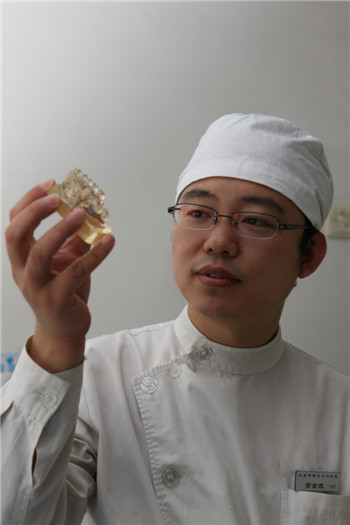 口腔科不同于其他临床科室,采用的治疗几乎全部都是操作性治疗方法,每一位患者的就诊时间较长。门诊量大的时候,高金波一上午会接诊20余名患者,工作量相当大。但他对待每位患者时都面带微笑,认真听患者主诉,详细解释病情,尽最大努力解决患者病痛。不久前,他接诊一名57岁的女性患者,要求修复缺失牙,患者先前曾到外院就诊,因颌骨条件太差未能进行缺失牙修复。他看到患者的第一感觉就是她太瘦了,面型像一个70多岁的老太太,让人难以直视,而且神情很淡漠。患者自己介绍在不到四十岁时因为牙周炎下颌牙就都脱落了,因为牙槽骨吸收太严重,常规的活动义齿根本无法固位和正常使用,因此每到吃饭时都发愁。听着患者的主诉,看着患者的神情,他动容了,决定一定要尽自己最大努力为她治疗。口腔检查显示患者下颌牙槽骨完全吸收,而且下颌骨体也严重萎缩,常规义齿无法修复。患者在口腔医院已经做过CBCT检查,高金波将数据导入专用手术导板软件,仔细分析并与手术导板制作技术人员和种植体厂家人员、技工沟通后,决定为患者行种植覆盖义齿修复下颌缺失牙。就手术的难度和风险与患者充分沟通后,实施了下颌植入2颗种植体支持的下颌覆盖义齿修复,上颌常规活动义齿修复,整个疗程历时6个月,义齿戴入3个月后,患者至门诊复查,可以明显看出患者胖了很多,性格也开朗了很多,脸上也看见笑容了,对高金波是万分感谢。