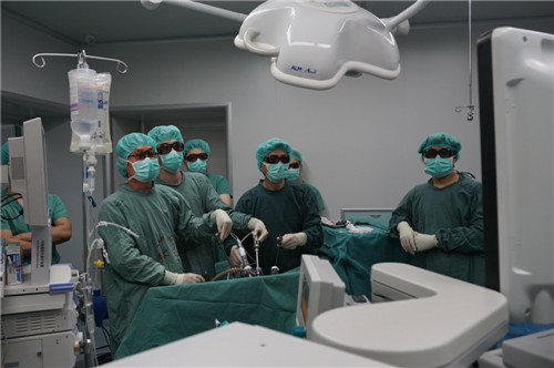 病例:患者赵先生今年70岁,因贫血到医院就诊,经过相关检查后被诊断为结肠癌,由于传统结肠癌根治手术创伤大,术后恢复慢,并发症多,并不适合赵先生这样高龄的患者。为了挽救他的生命,普通外科孟祥朝主任应用3D腹腔镜技术为其成功实施了扩大右半结肠根治术,在手术室上演了一部3D大片。