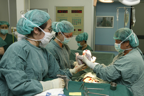 除夕夜,产科副主任医师王方,医生魏青、李倪值班,急诊产妇接二连三入院,既有宫外孕产妇,又有外院转入孕33周胎盘早剥、早产的产妇。该产妇胎盘剥离面积达2/3,随时有可能发生胎死宫内及大出血、肾功能衰竭等危险,母婴生命岌岌可危。在此紧急情况下,王方副主任医师、魏青医生当机立断即刻手术,自病人入院到手术开始仅用了10分钟就完成了所有术前准备,在产科、新生儿科、麻醉科及手术室等医护人员共同努力下,挽救了产妇及早产儿的生命,家属感激涕零,不停的致谢。作为医务人员,除夕夜虽然我们不能与家人团聚,但我们挽救了母婴的生命,我们感到无上的光荣和欣慰。
