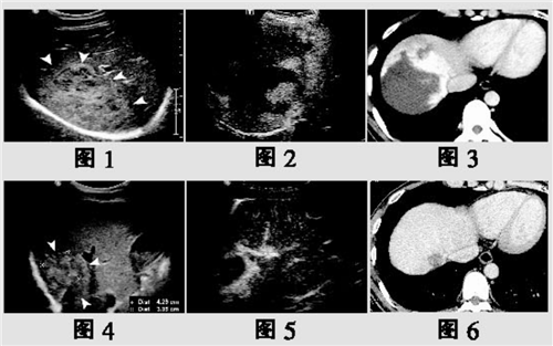 术前B超、超声造影及增强CT均示:肝右叶巨大占位为肝血管瘤,大小约13.3×8.4厘米(如图1~3)。术后半年B超、超声造影均示:血管瘤治疗后明显缩小,大小约4.3×3.9厘米(如图4~5)。术后一年增强CT示:血管瘤治疗后大小约2.5×2.0厘米,临床治愈(如图6)。
