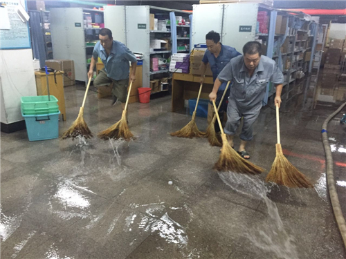 位于地下2层的物资科遭遇“水患”,大量积水顺着墙流下。不到早上7时,已有4名物资科人员到岗,检查各库房情况,发现一个临时库房出现墙体透水,立即开始进行排水工作。同时,为了不使库房内重要的医用耗材受到雨水的侵袭,又紧急搬运9大箱耗材,将其安置到干燥安全的位置。下午在持续性强降雨的袭击下,物资科的库房再次出现进水险情。面对这种情况,物资科全体人员上阵,齐心合力搬运砖块、水泥,在库房里临时垒起一道1.7米的挡水矮墙。