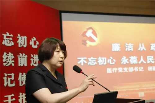 医疗党支部书记田丽以《廉洁从政不忘初心,永葆人民公仆本色》为题,以古论今,提出“廉者,正之本矣”,指出党员干部要做到“四个必须”,即必须始终做到心中有党;必须始终做到心中有民;必须始终做到心中有责;必须始终做到心中有戒,并以医务界廉洁从政的楷模华益慰为例,展示出医术高超与人格高尚的完美结合。最后提出,政之所兴在顺民心,政之所废在逆民心,只有不忘廉洁从政的初心,才能永葆人民公仆的本色。